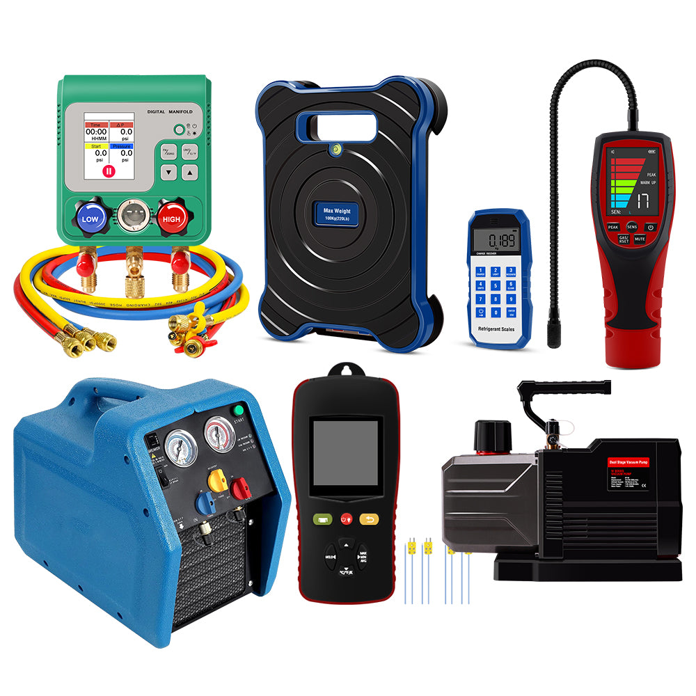 Aprvtio AHTS-100PRO DC 12CFM HVAC Repair Tool Set with Digital Manifold, K-type Thermometer, Refrigerant Leak Detector, Dual Stage DC 12CFM Vacuum Pump, Bluetooth Refrigerant Scale with Bubble Level