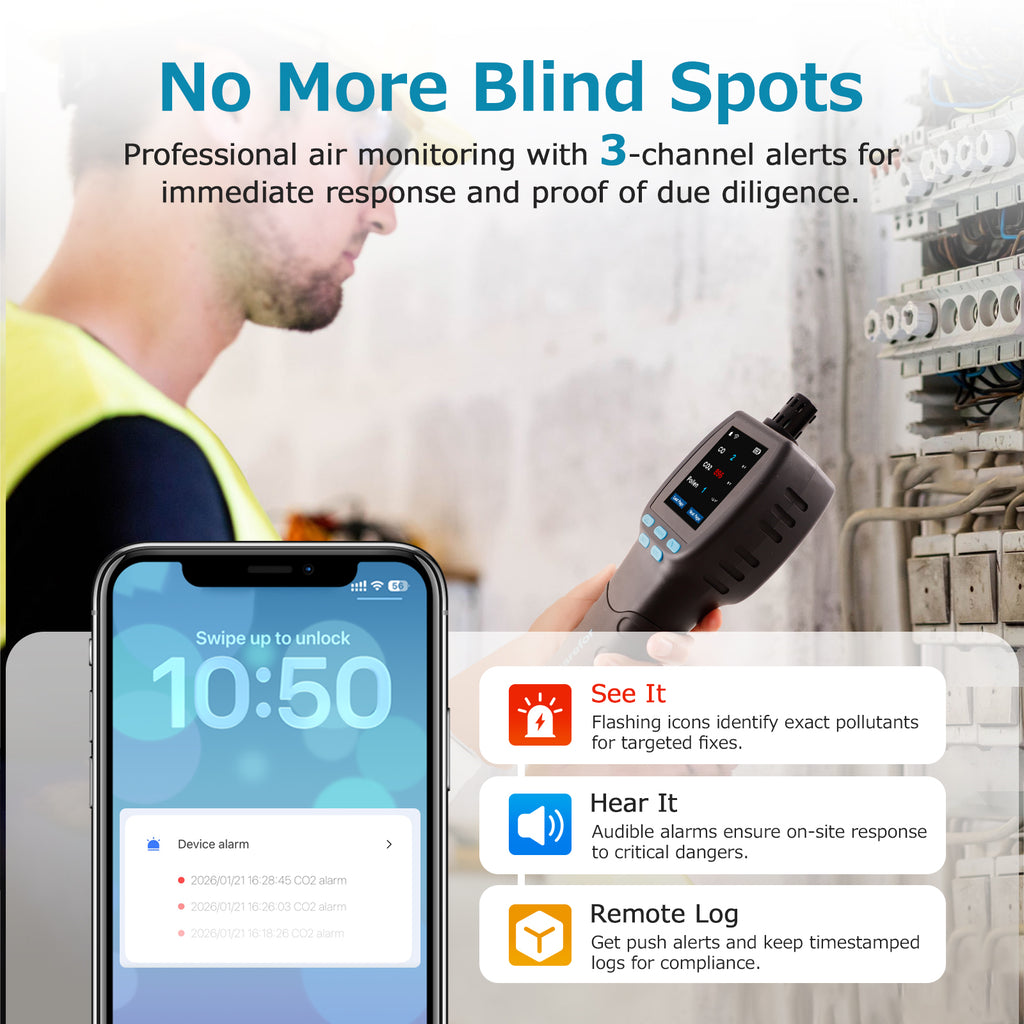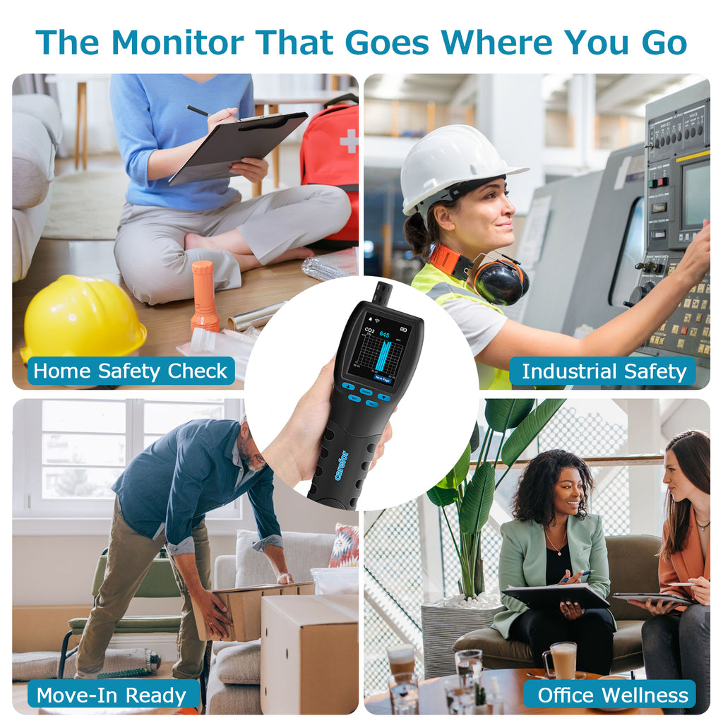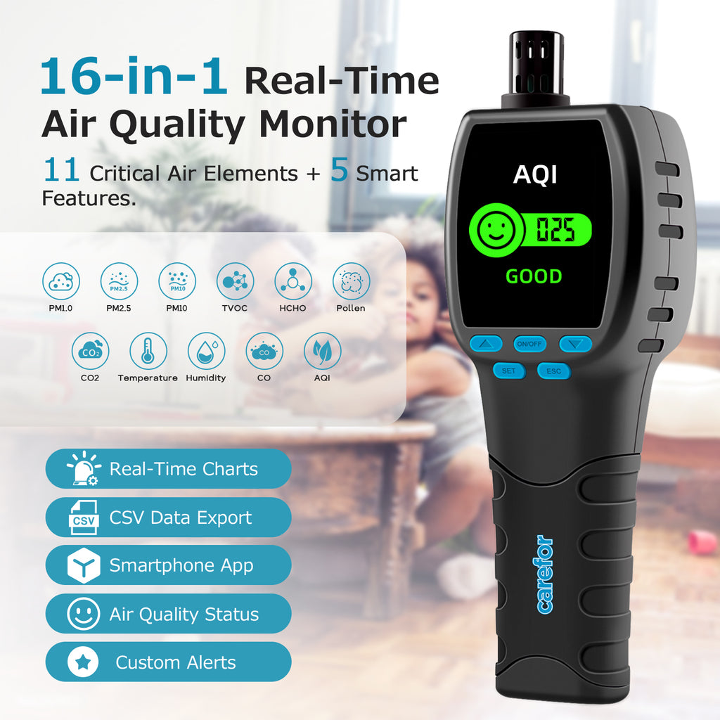 Carefor Upgraded CFโ€‘60 PP SMART Handheld Air Quality Monitor, 16โ€‘inโ€‘1 Air Pollution Detector with Realโ€‘Time App Tracking, 12โ€‘Hour Onโ€‘Screen Charts, Rechargeable Longโ€‘Standby Battery for Home&Workplace